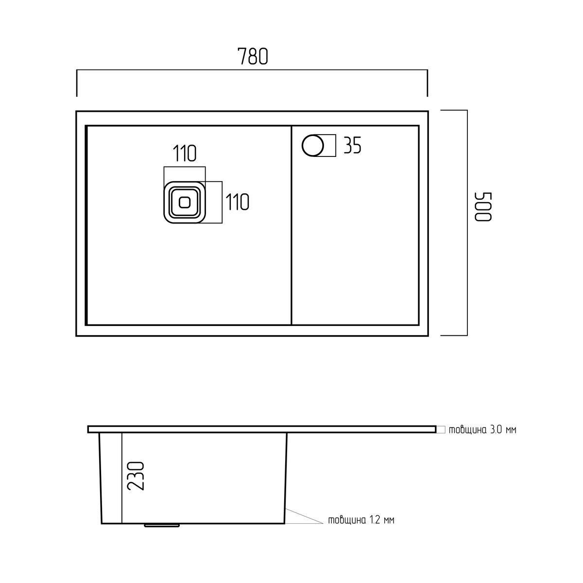 Кухонна мийка Platinum Handmade нержавійка 78х50 L (один отвір, квадратний сифон, 3,0/1,0 мм)