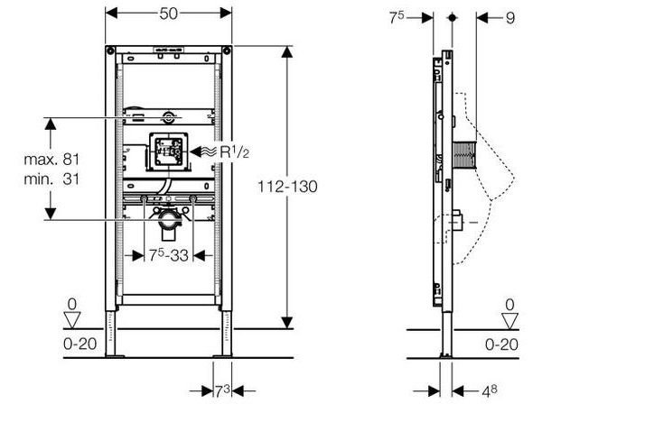 - Высота элемента регулируется от 112 см до 130 см, в зависимости от санфаянса писсуара
