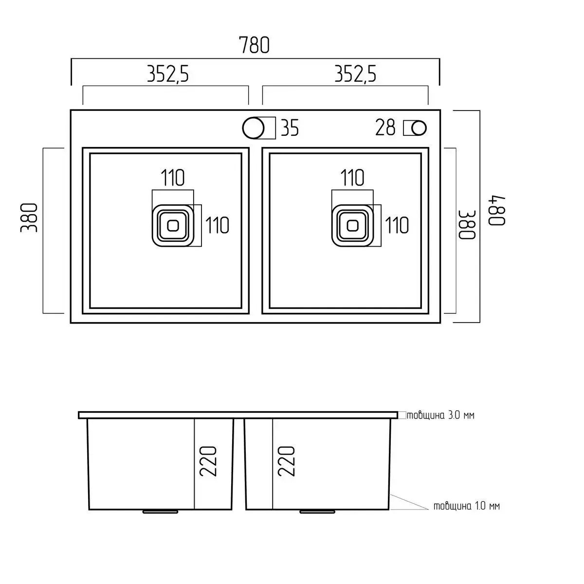 Кухонная мойка Platinum Handmade HDB из нержавеющей стали 3 мм, 78x48x23 см, Прямоугольная (000036122)