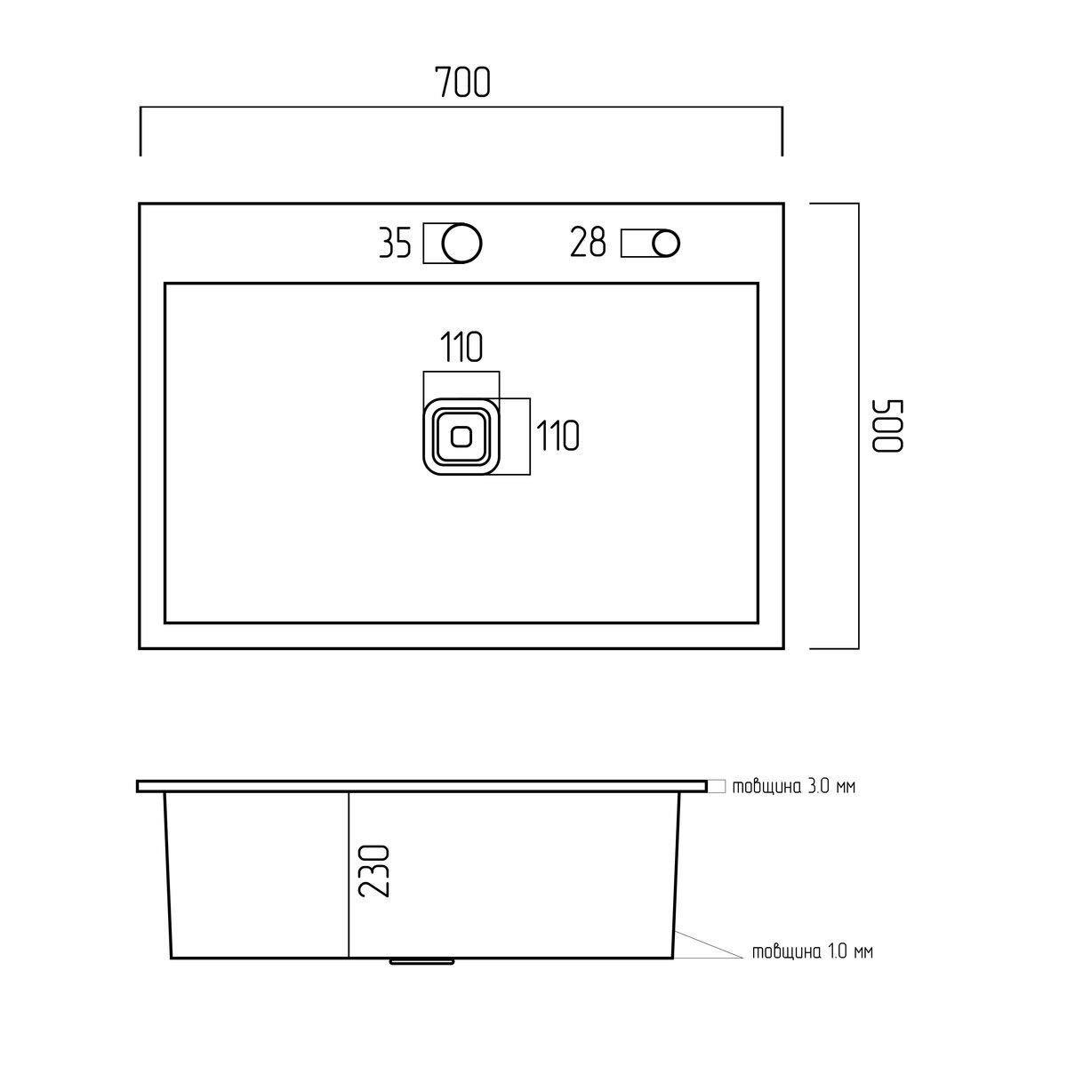Кухонная мойка Platinum Handmade HSB из нержавеющей стали 3 мм, 70x50x23 см, Прямоугольная (SP000037022)