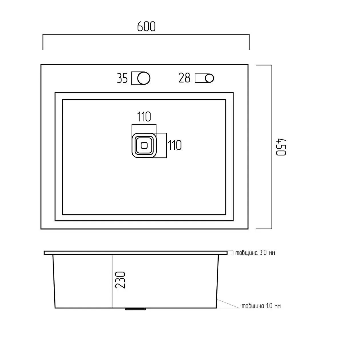 Мойка имеет чашу глубиной 230 мм, что обеспечивает удобство ежедневного использования. Тип установки – универсален, как на столешницу, так и под столешницу. Для монтажа мойки требуется ширина столешницы не менее 500 мм.
