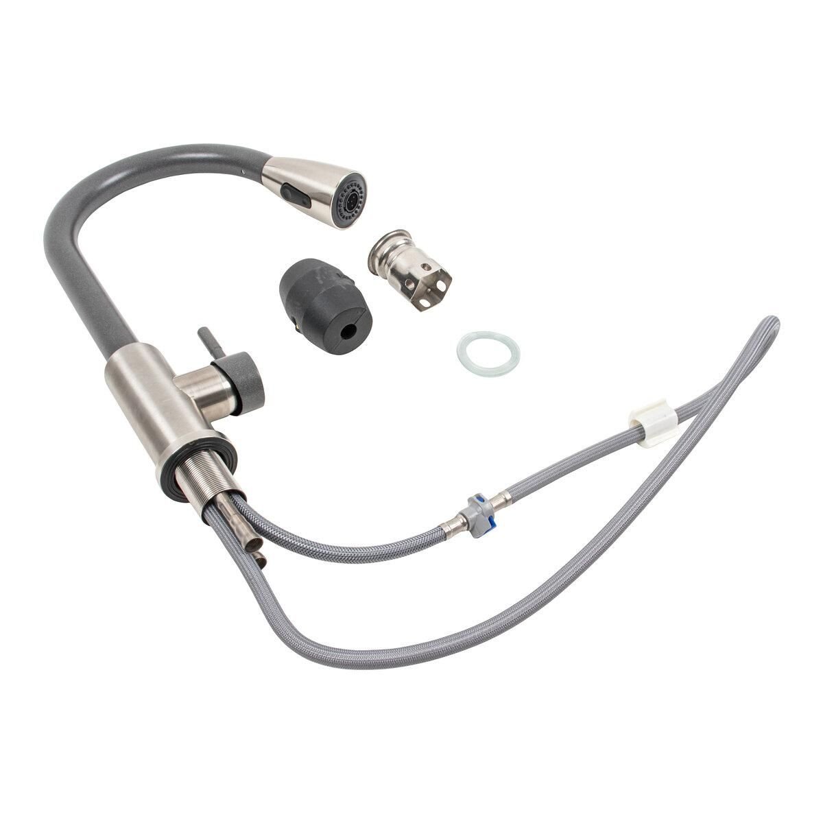 Шланг смесителя выдвигается до метра, имея длину около 900 мм, что добавляет удобства и гибкости во время использования.